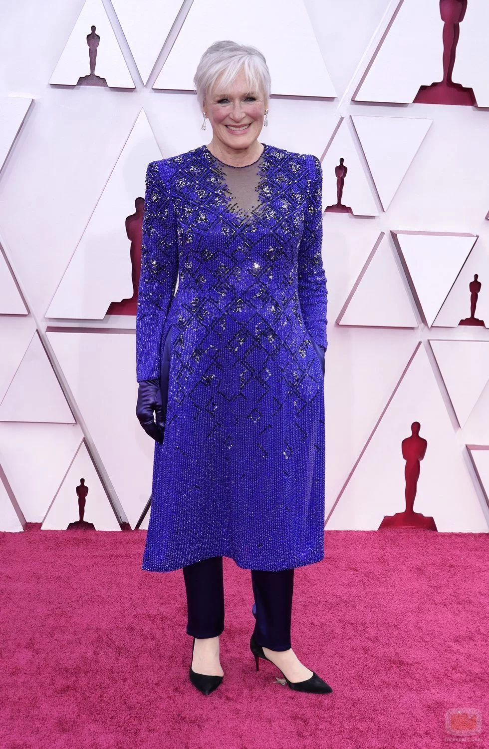 Glenn Close, vestida de azul,posa en la Alfombra Roja de la edición número 93 de los Oscar 2021, edición celebrada en plena pandemia del coronavirus.