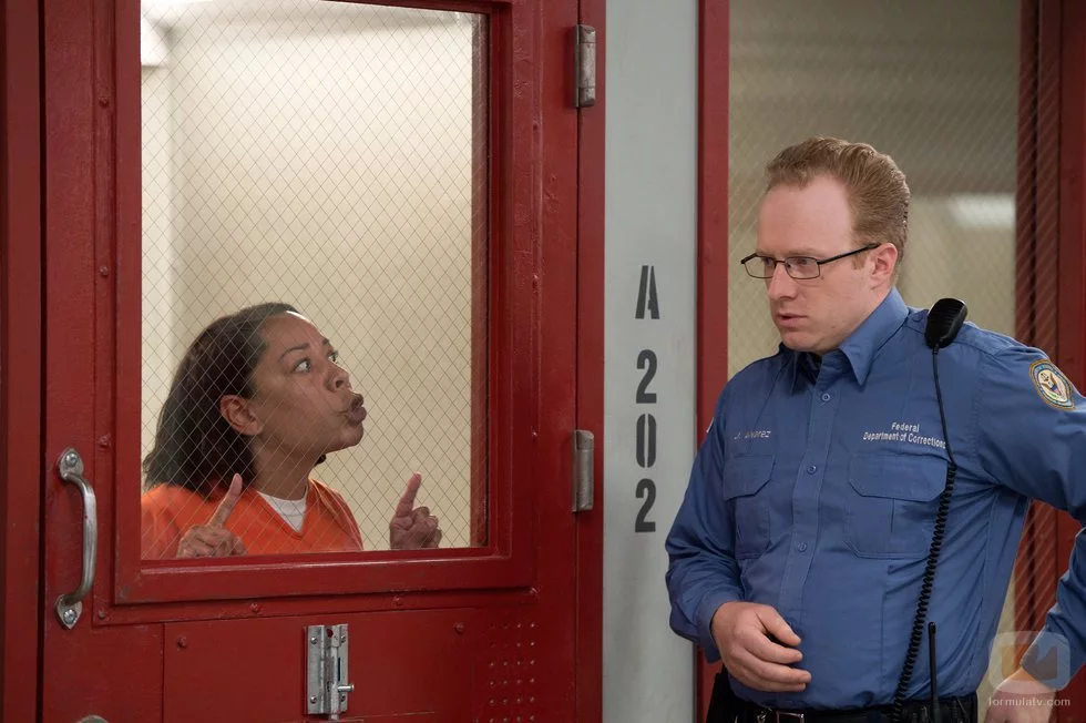 El personaje de Selenis Leyva habla con un atemorizado agente de la nueva cárcel donde se trasladan las reclusas de la ficción carcelaria.