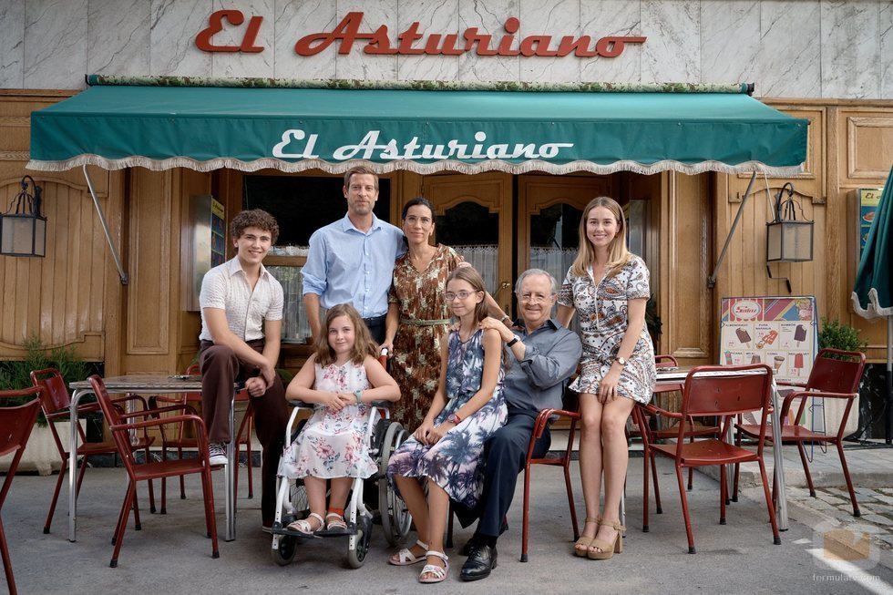Todos los miembros de la familia Gómez Sanabria posan delante de El Asturiano durante la octava temporada de 'Amar es para siempre'. Álvaro de Luna es "Manolín", Manuel Baqueiro es Marcelino, Itziar Miranda es Manolita, José Antonio Sayarés es Pelayo y Paula Usero es Luisita Gómez.
