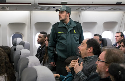 La Guardia Civil para a Antonio Recio, que está sentado junto a su hijo Toín, en pleno avión ante la mirada de todos los pasajeros.