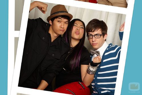 Harry Shum Jr. (Mike), Jenna Ushkowitz (Tina) y Kevin McHale (Artie) con su pose más chula para el fotomatón de la serie 'Glee'.