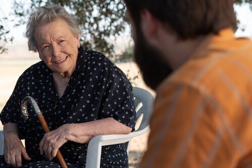 La abuela Herminia (María Galiana) charla con su nieto Carlos (Ricardo Gómez) en Sagrillas durante el episodio final de la serie de Grupo Ganga y RTVE.