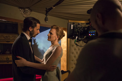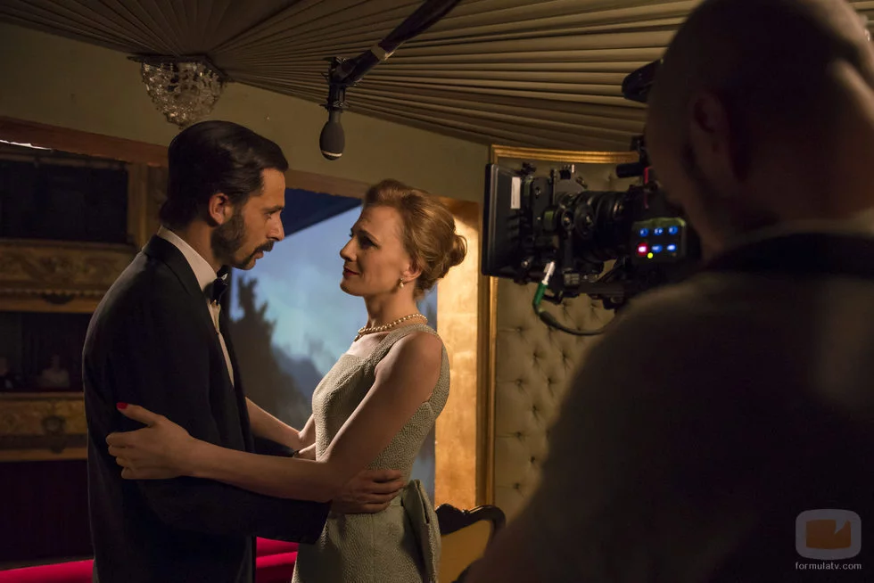 Hugo Silva y Belén Fabra en el rodaje de la tercera temporada de 'El Ministerio del Tiempo'