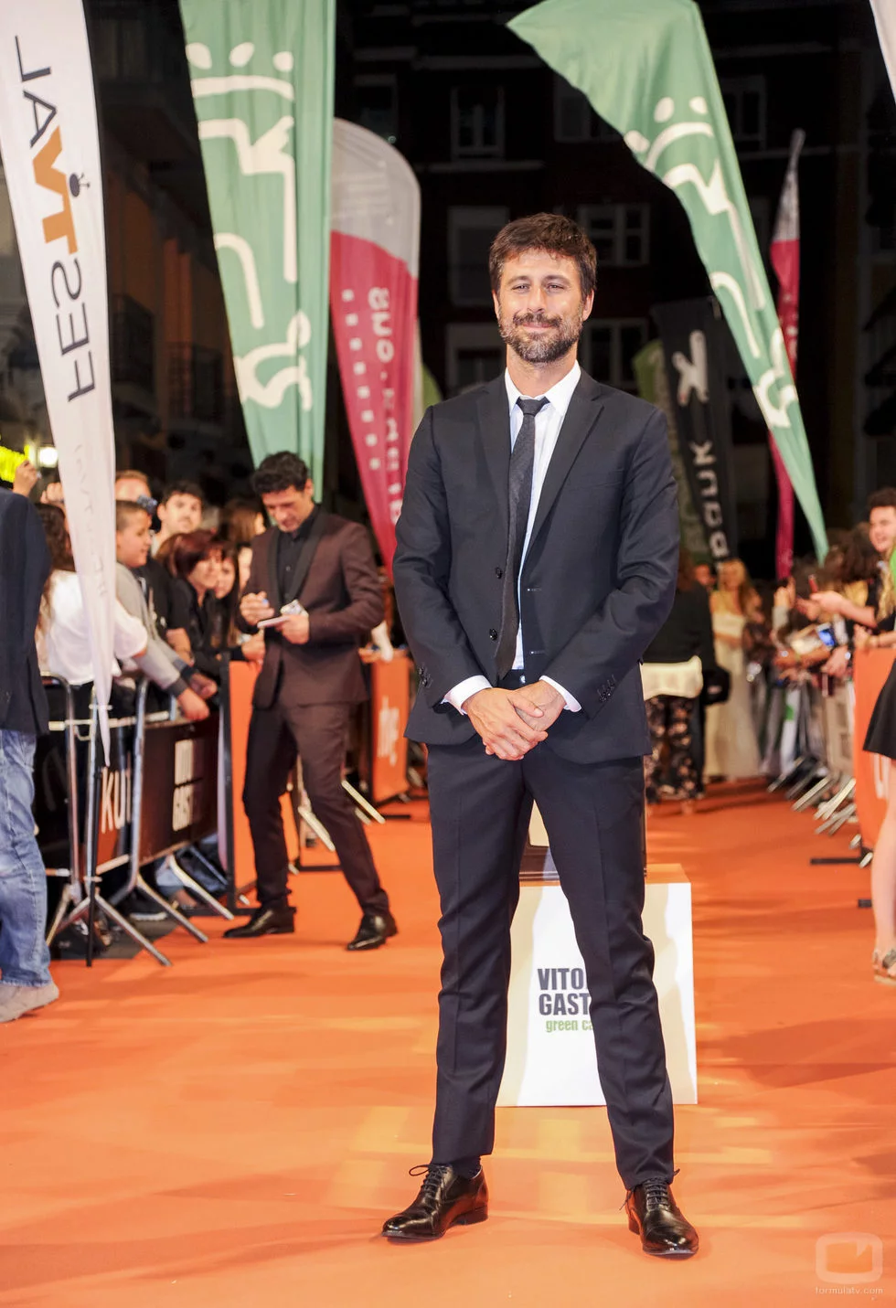 El actor de 'El Ministerio del Tiempo' Hugo Silva se ha cogido de manos para posar en la alfombra del FesTVal de Vitoria.