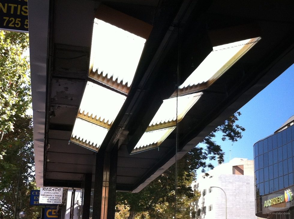 Lámpara de tubos fluorescente que cuelga de la parte exterior del local del programa, en la calle Alcalá.
