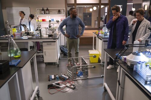 John Owen Lowe, Rob Lowe, Lamorne Morris, Rachel Marsh y Emma Ferreira aparecen en una escena del capítulo 'La Universidad de Ellis' de 'Unstable'.