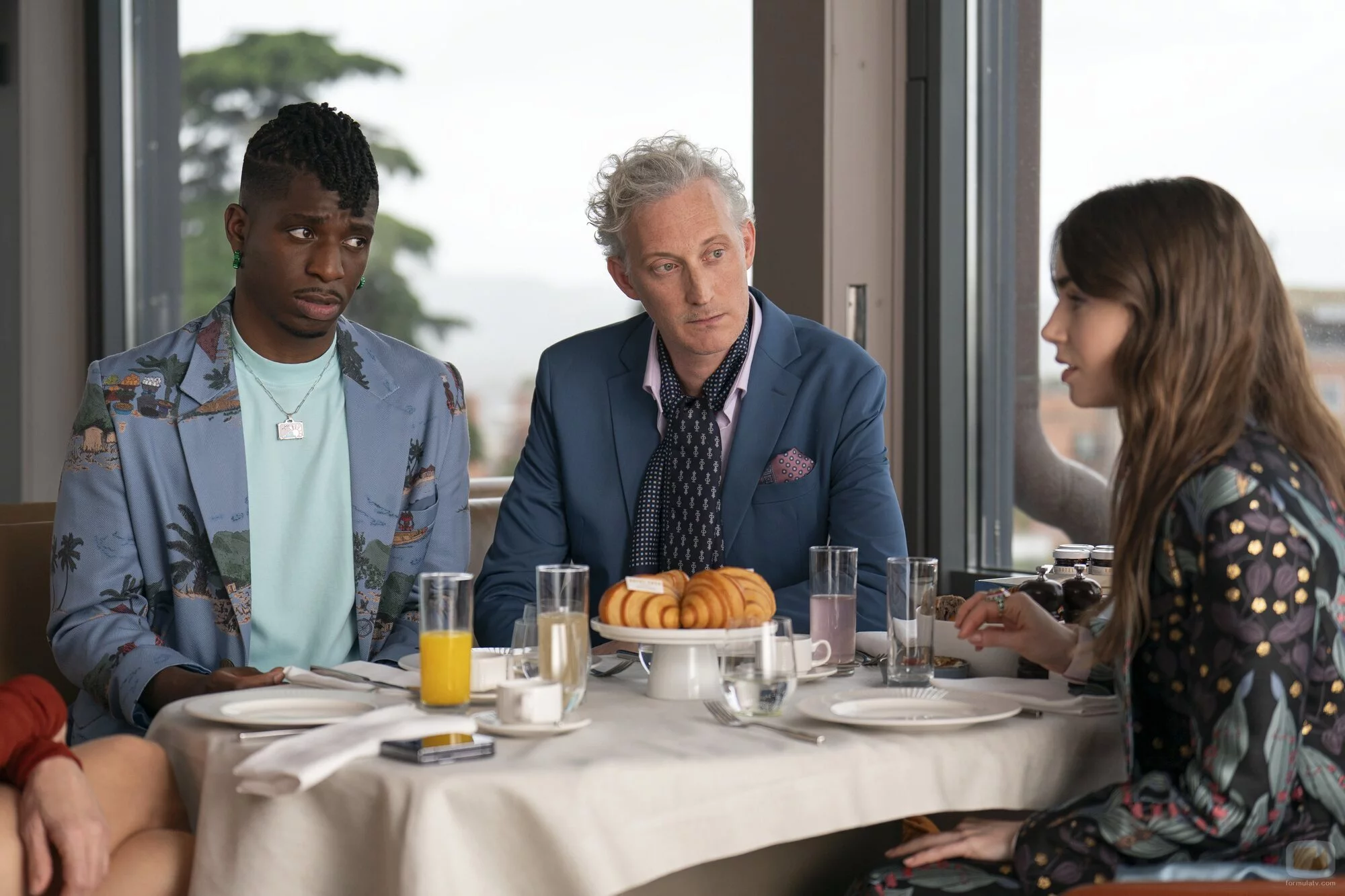Lily Collins, Bruno Gouery y Samuel Arnold aparecen en una escena del episodio 4x10 de 'Emily in Paris', la serie de Netflix.
