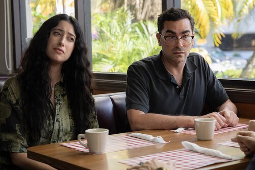 Taylor Ortega y Dan Levy aparecen en una imagen promocional del episodio 'Me lo he pasado muy bien contigo' de 'Errores épicos'.
