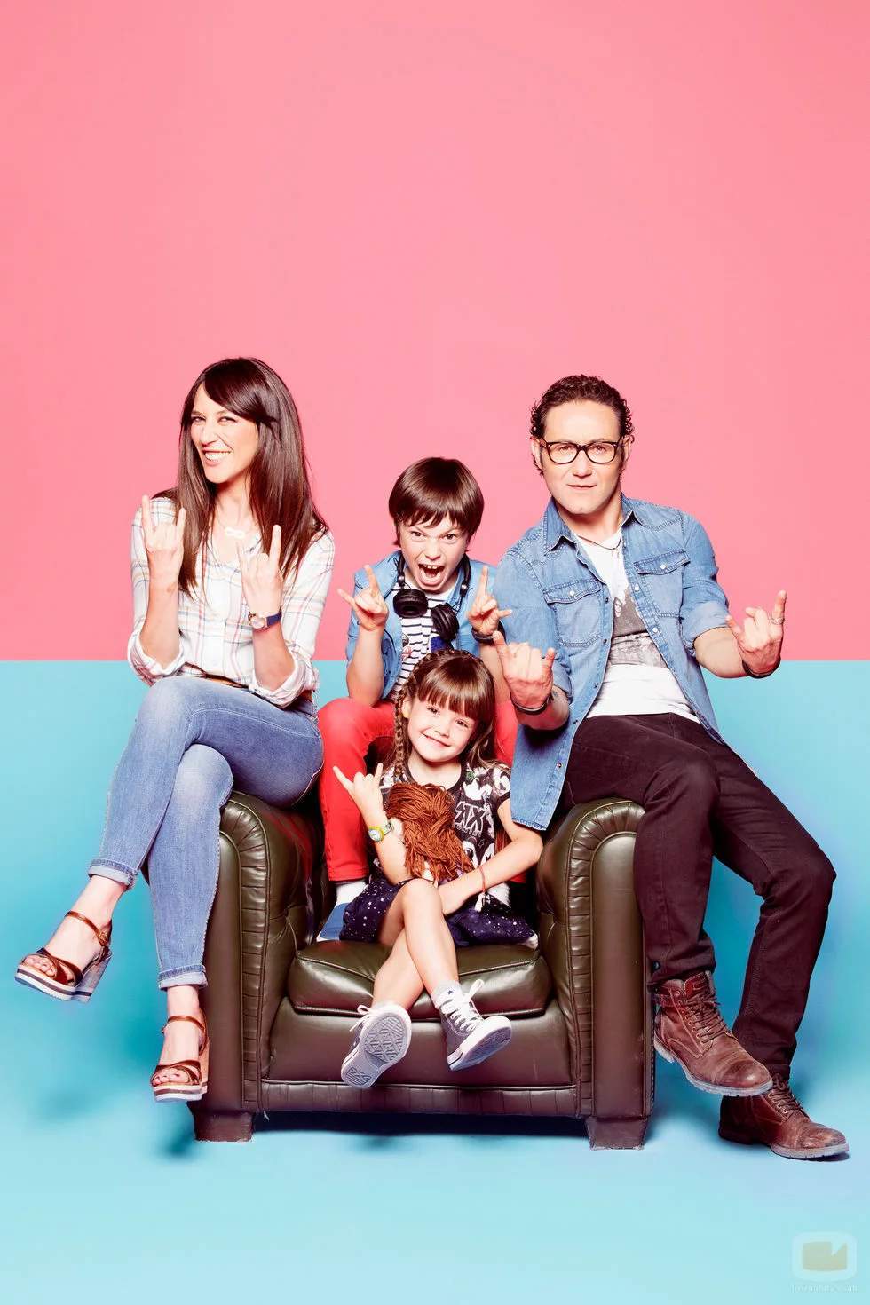 Imagen de la familia protagonista de 'Ella es tu padre', la nueva ficción de Telecinco. Los cuatro miembros aparecen en un sofá.