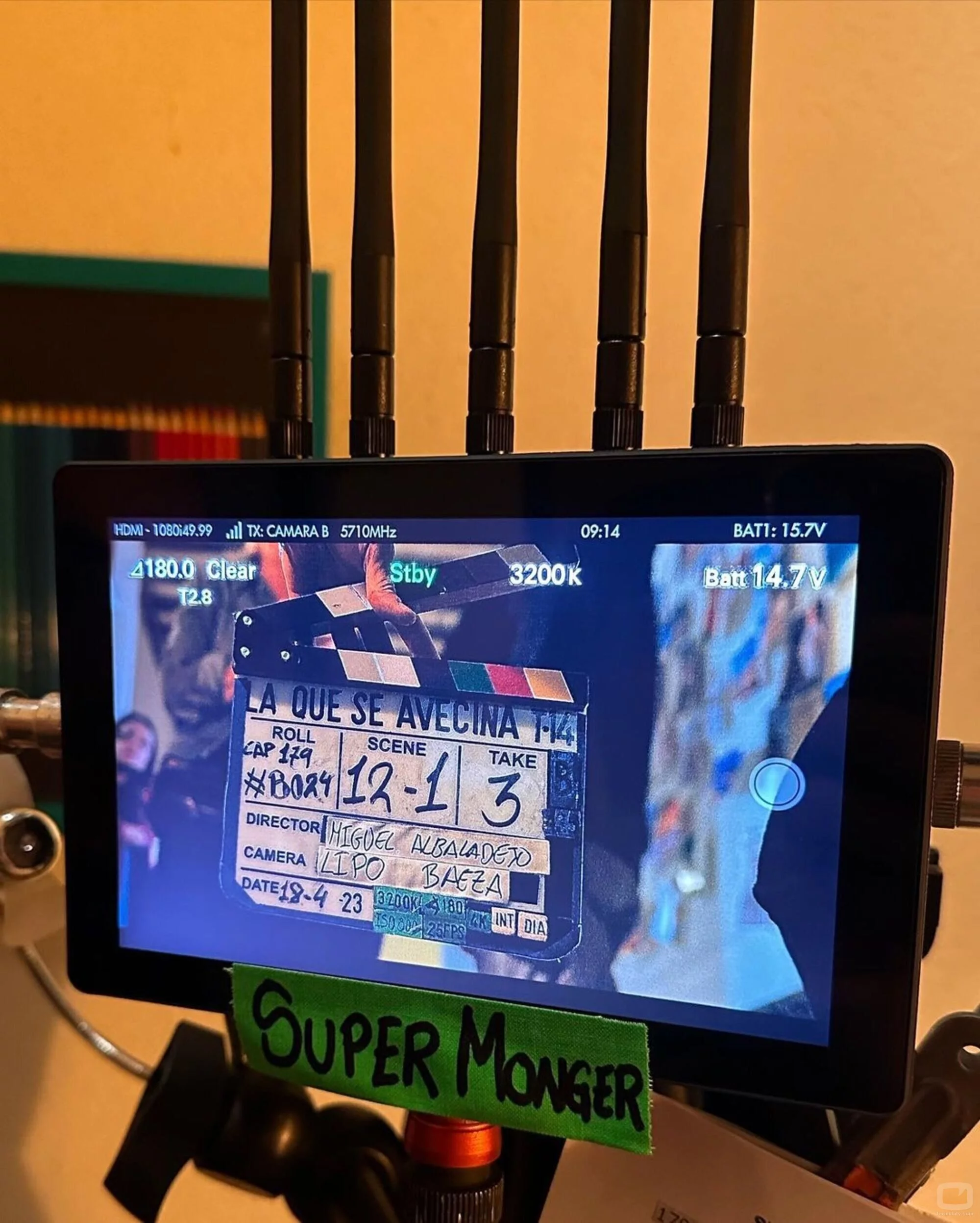 A través de un monitor, se ve la claqueta del rodaje de la temporada 14 de 'La que se avecina', la segunda en los decorados de la calle Contubernio.