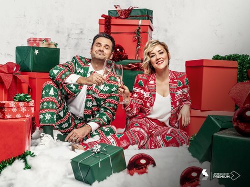 La pareja de presentadores posa con copas de champán en un decorado navideño para las Campanadas 2020-2021.