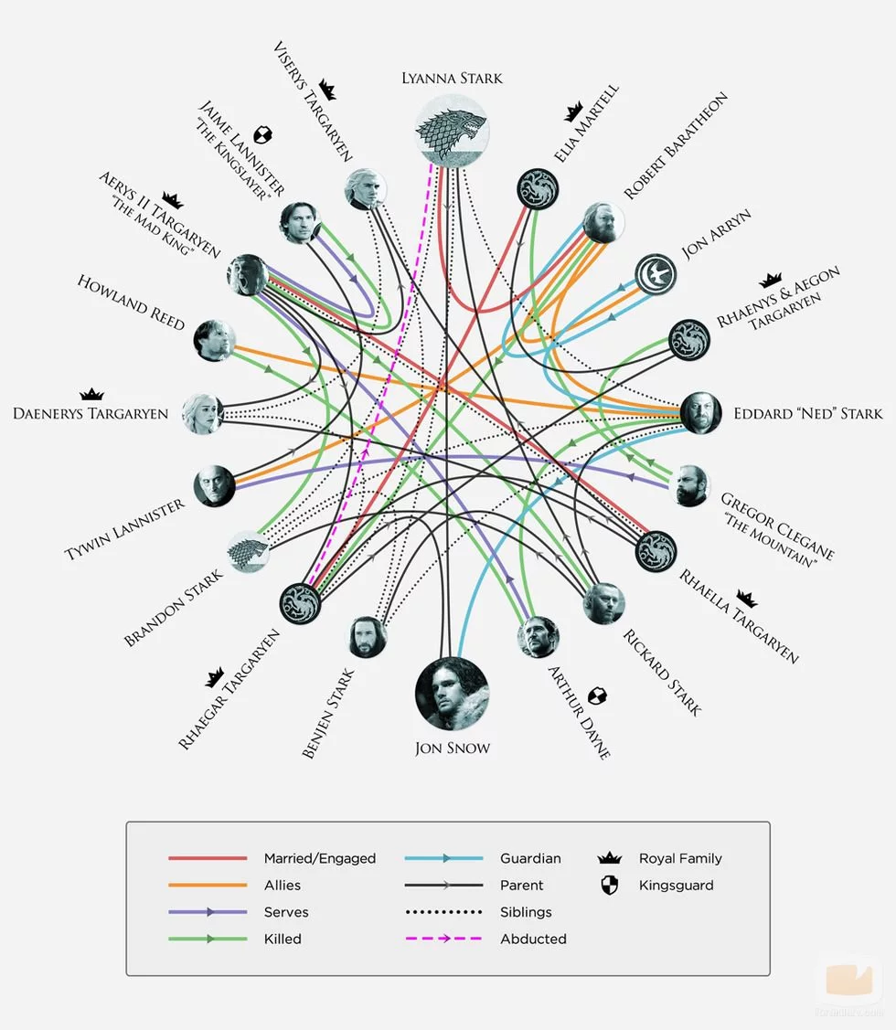 HBO ayuda a los seguidores de 'Game of Thrones' a seguir las relaciones de sus personajes con esta infografia en la que se señalan los lazos sentimentales, familiares, alianzas o muertes. En ella se puede ver, entre otros datos, que Jon Snow es realmente hijo de Lyanna Stark y Rhaegar Targaryen.