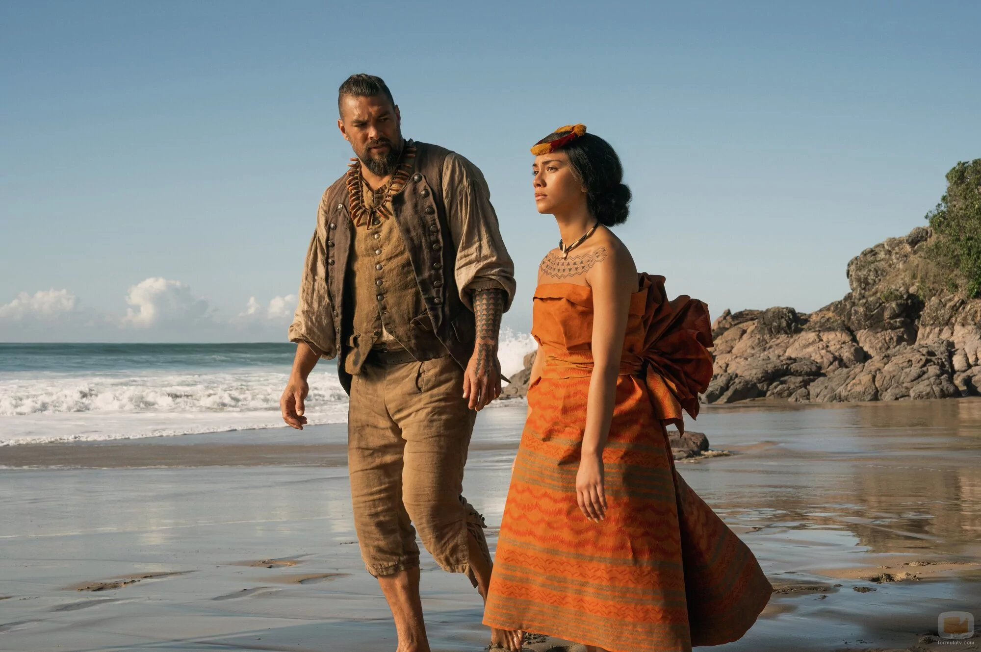 Luciane Buchanan y Jason Momoa aparecen en una imagen del episodio 'El día de los cráneos ensangrentados' de 'Chief of War'.
