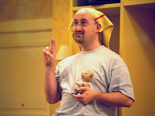 Javier Cámara, Paco en la serie, con un trapo a modo de pañoleta en la cabeza y sujetando una figura de un oso vestido de jugador de fútbol.