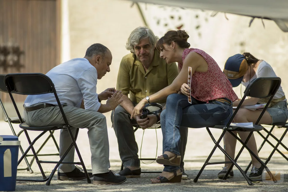 Javier Gutiérrez y Malena Alterio hablan sentados mientras comen algo, durante el rodaje de la nueva ficción de Movistar+, 'Vergüenza'.