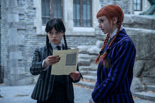 Evie Templeton y Jenna Ortega aparecen en una escena del episodio 'Si las tristezas hablaran' de la serie 'Miércoles'.