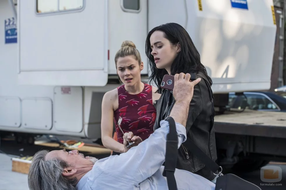 Jessica Jones y Trish Walker con un hombre herido en el suelo en la segunda temporada de 'Jessica Jones'