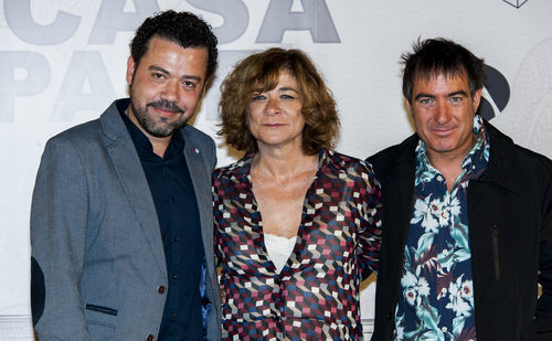 Jesús Colmenar, Álex Pina y Sonia Martínez posan en la presentación de 'La Casa de Papel'
