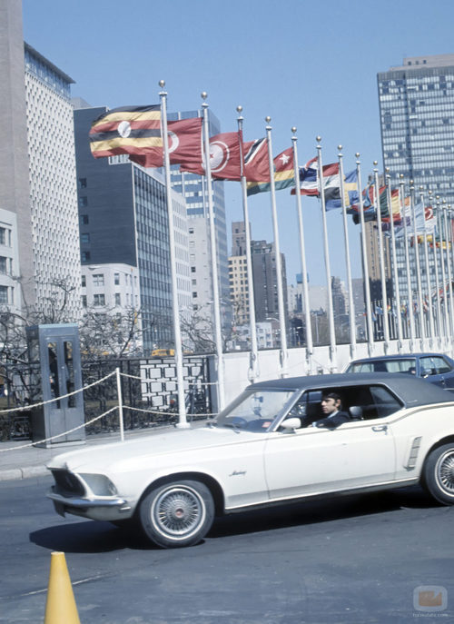 El periodista Jesús Hermida conduciendo un coche a la puerta de la sede de las Naciones Unidas en Nueva York. Hermida fue el primer corresponsal de TVE en aquella ciudad.