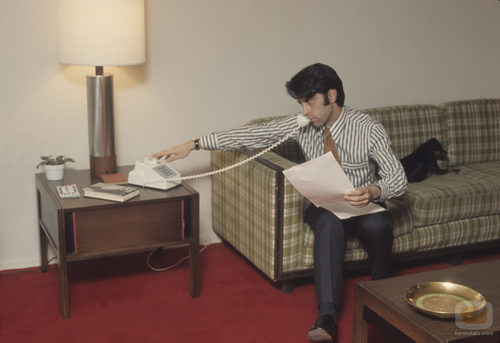 El periodista y presentador Jesús Hermida hablando por un teléfono de cable en una imagen de la década de los 70.