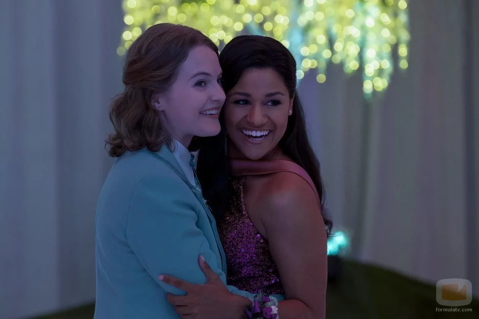 Emma (Jo Ellen Pellman) y Alyssa (Ariana DeBose) abrazadas y vestidas de forma elegante en la producción de Netflix.