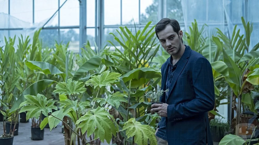 Joel Bosqued sostiene una planta en 'El Internado: Las Cumbres'