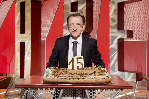El presentador del concurso 'Saber y ganar' sonríe con el pastel que recuerda que el espacio de La 2 celebra 15 años de emisiones.