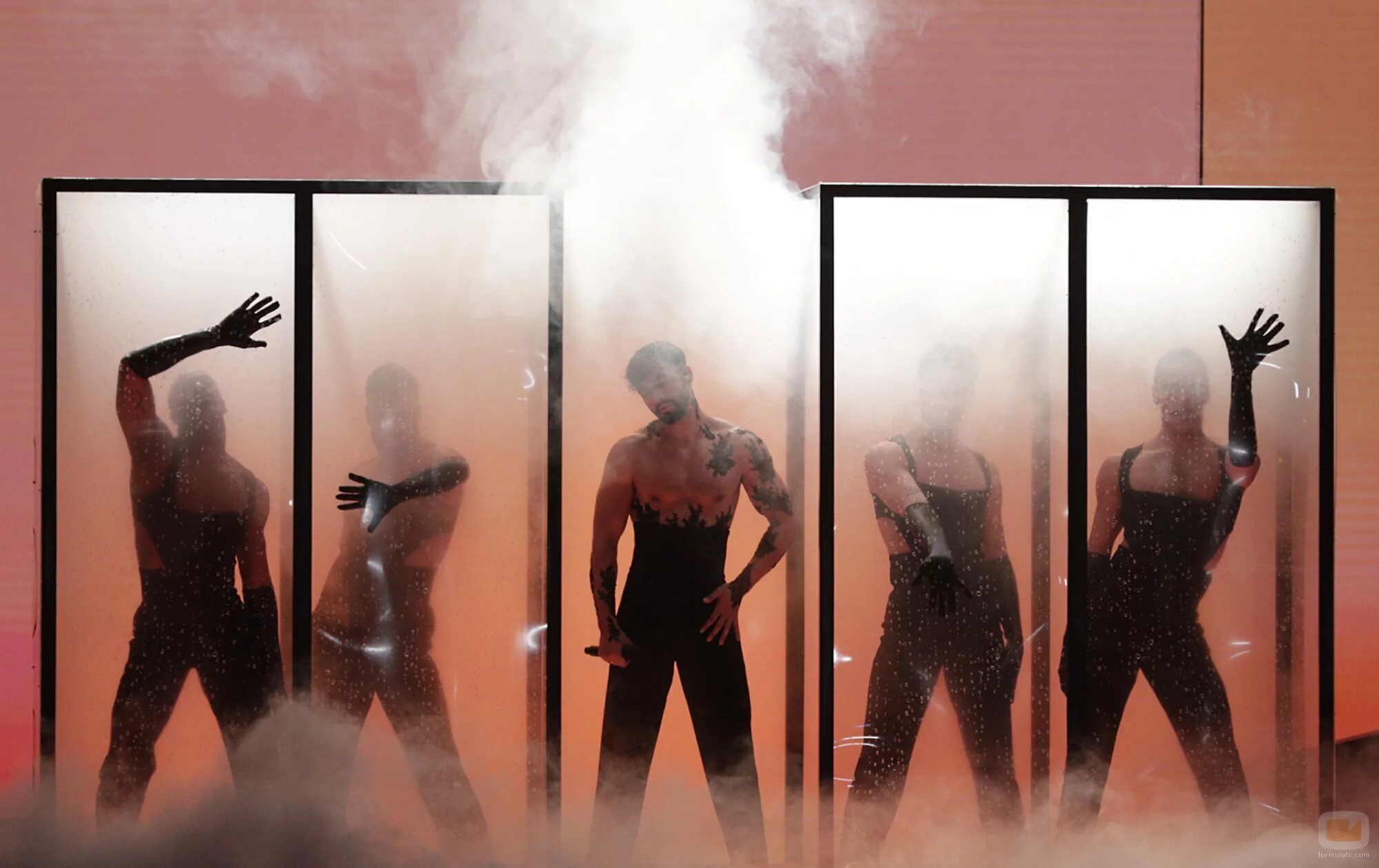 Sobre el escenario del Benidorm Fest 2024 se suben Jorge González y sus bailarines interpretando el tema 'Caliente'.