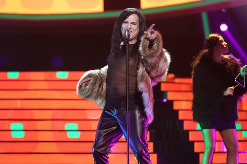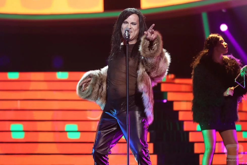 El cineasta José Corbacho interpreta a Mario Vaquerizo junto a su banda Las Nancys Rubias para cantar "Peluquitas" durante el Concierto de Año Nuevo en 'Tu cara me suena'.