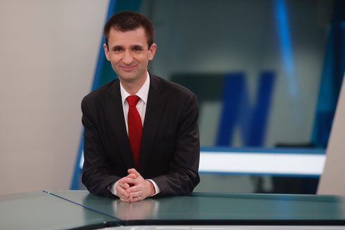 El director de Telemadrid, José Pablo López posa en una de las mesas de los informativos de la cadena madrileña.