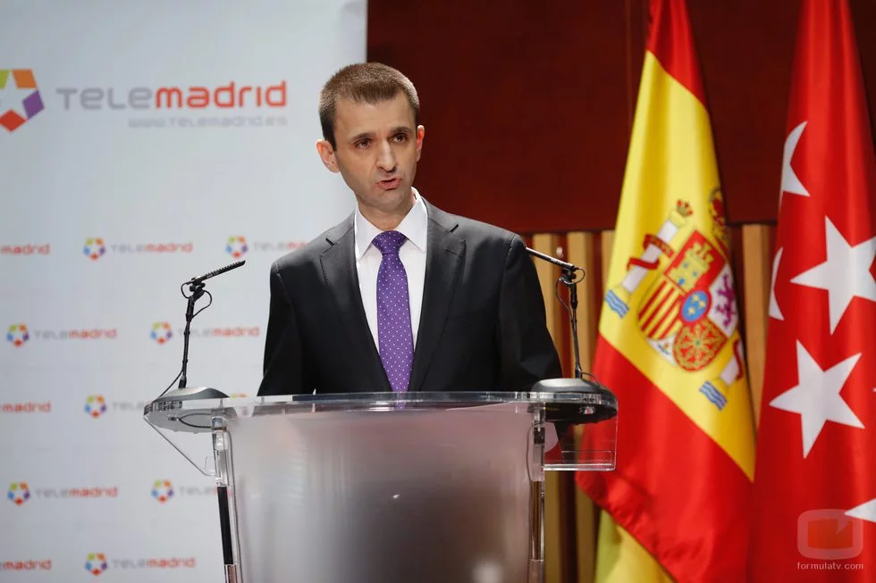 José Pablo López pronunciando unas palabras en el atril tras su nombramiento como nuevo director de Telemadrid.