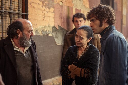 Los actores, que dan vida a Onofre y a su madre, protagonizan una escena con el padre del joven periodista sevillano.