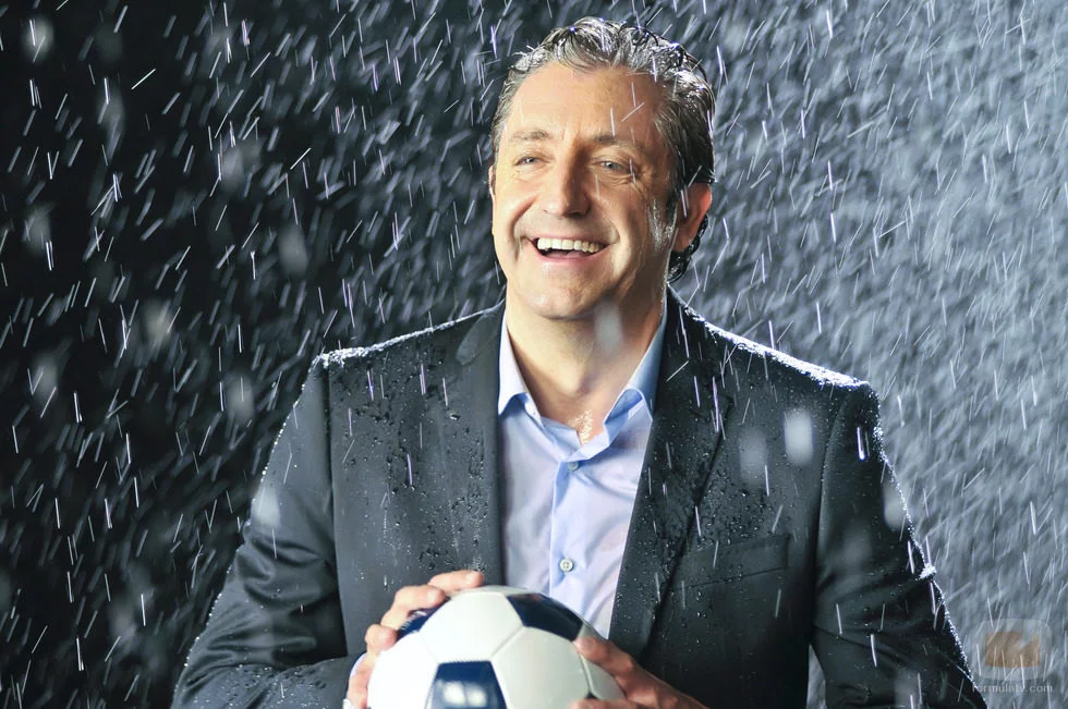 El director y presentador de 'Jugones' posa bajo la lluvia en la promo "Nos mojamos" de laSexta.