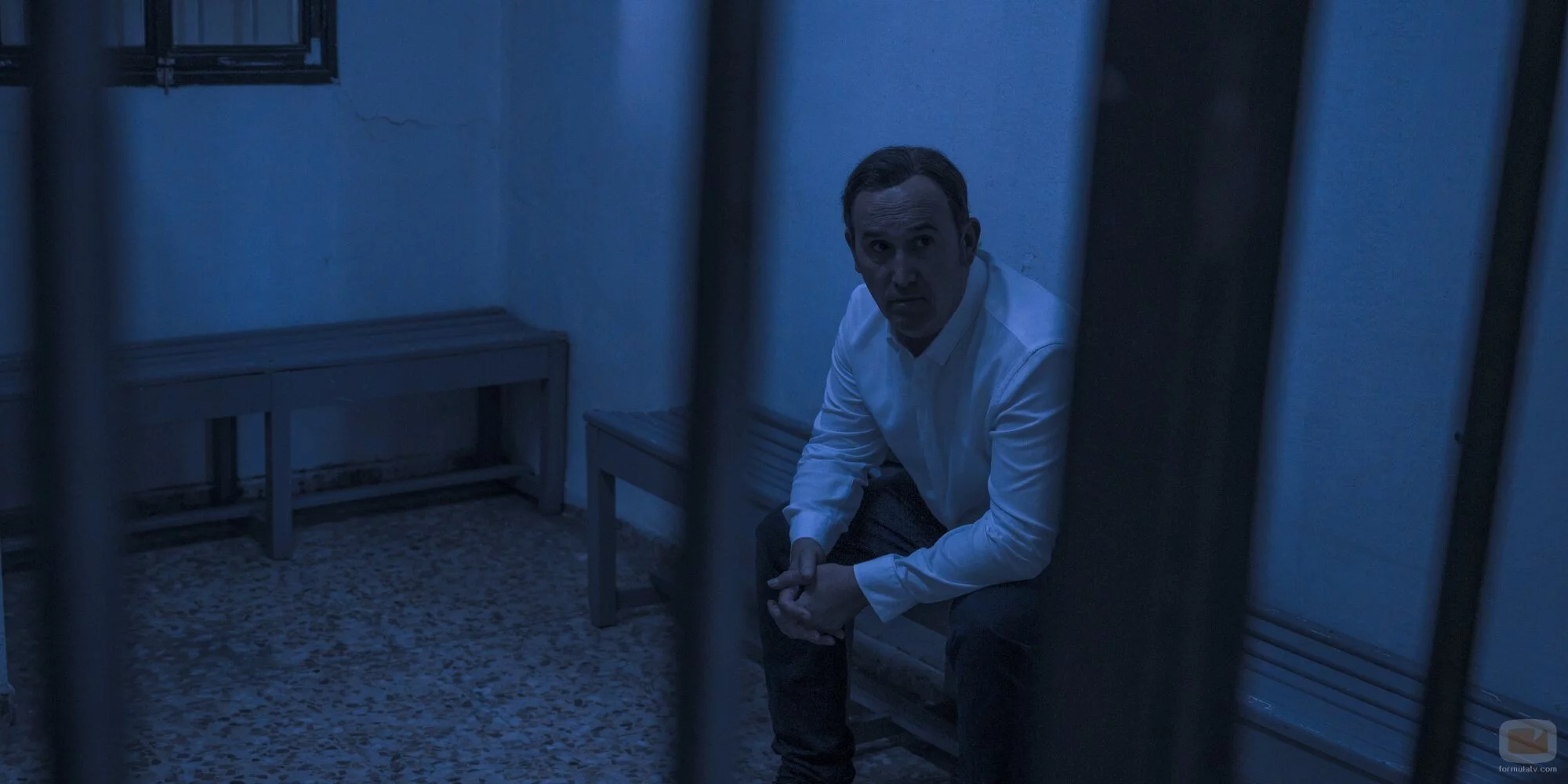 Juan Carrasco (Javier Cámara) mira a cámara mientras permanece en una cárcel durante uno de los episodios de 'Venga Juan', la comedia de HBO Max y producida por 100 Balas.