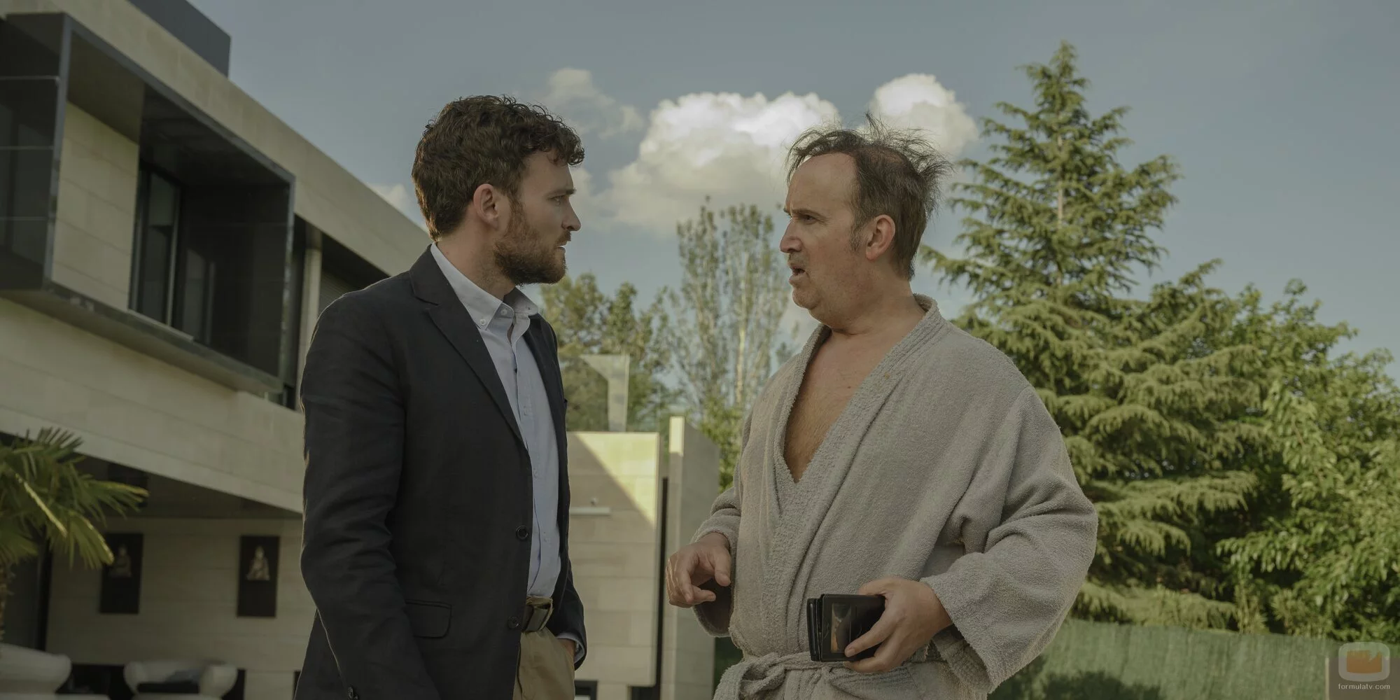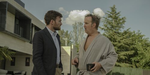 Juan Carrasco (Javier Cámara) habla con Víctor (Adam Jezierski) en un escenario exterior durante uno de los capítulos de 'Venga Juan', la comedia de HBO Max producida por 100 Balas.