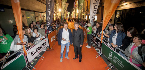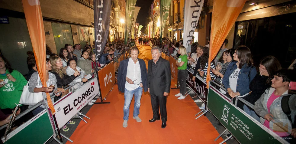 Los actores del 'Ministerio del Tiempo' Juan Gea y Jaime Blanch posan juntos en la alfombra naranja que adorna la IX edición del FesTVal de Vitoria.