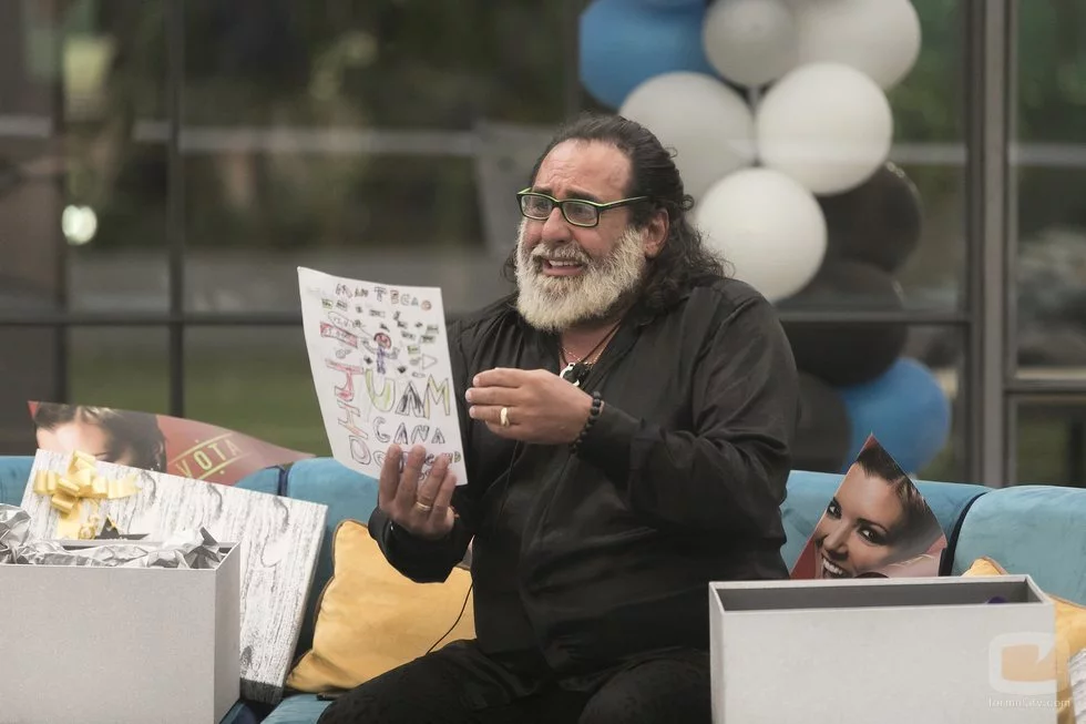 Juan Miguel recibe entre lágrimas un dibujo de su nieto, junto a un pañuelo y una pulsera, en la Gala 14 de 'GH Dúo'.