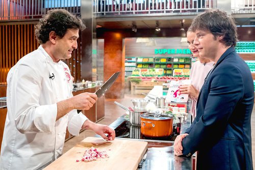 Pepe Rodríguez cocina y sujeta un cuchillo en la mano mientras Samantha Vallejo- Nágera y Jordi Cruz le miran atentamente.
