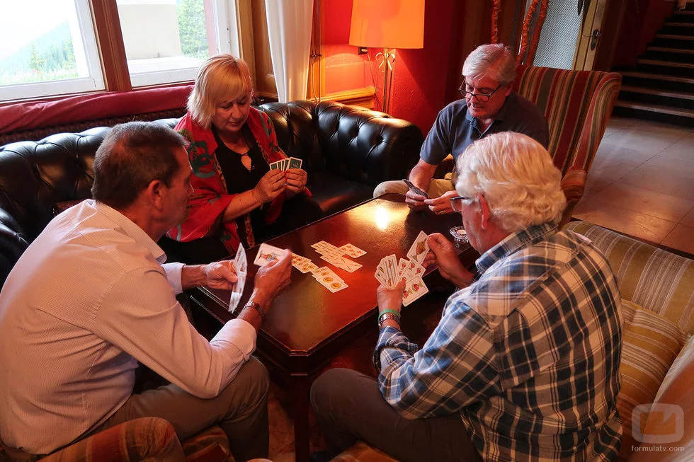 Tres hombres y una mujer mayores de cincuenta años juegan la baraja española desde los sillones de 'Hotel Romántico'.