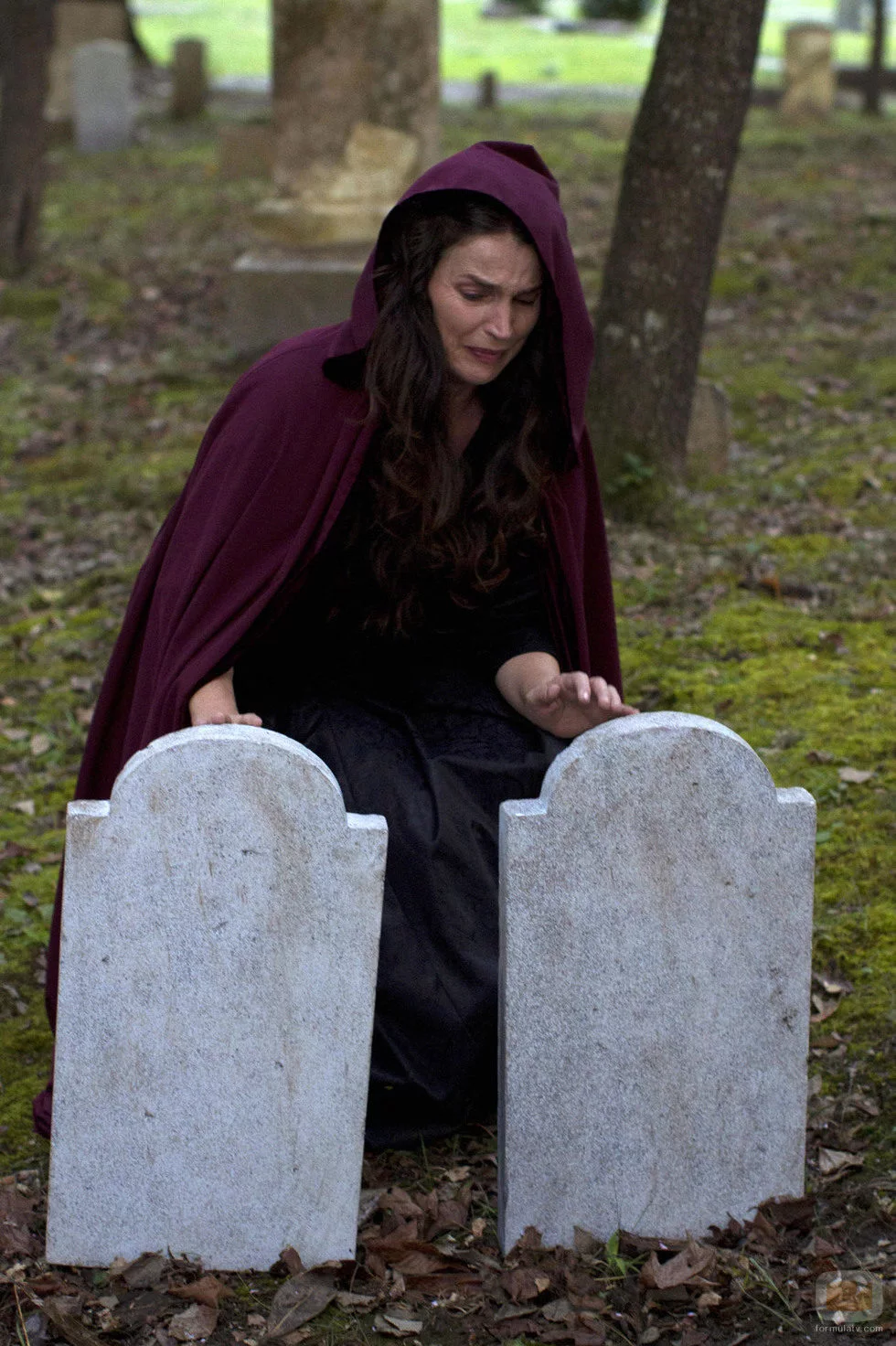 Joanna Beauchamp (Julia Ormond) llora ante dos lápidas en 'Las brujas de East End'.