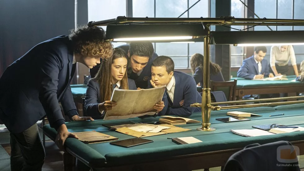 Gonzalo Díez, Asia Ortega, Daniel Arias y Paula del Río miran unos documentos en una escena de 'El internado: Las Cumbres'