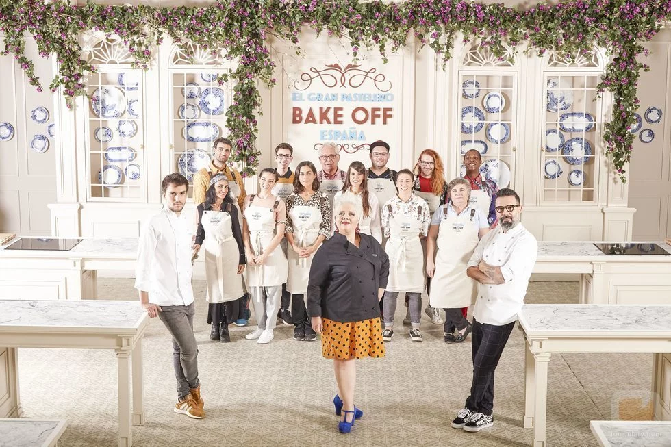 Dani Álvarez, Betina Montagne y Miquel Guarro posan junto a los doce concursantes de 'Bake Off España' que compiten por convertirse en el mejor pastelero amateur del país.