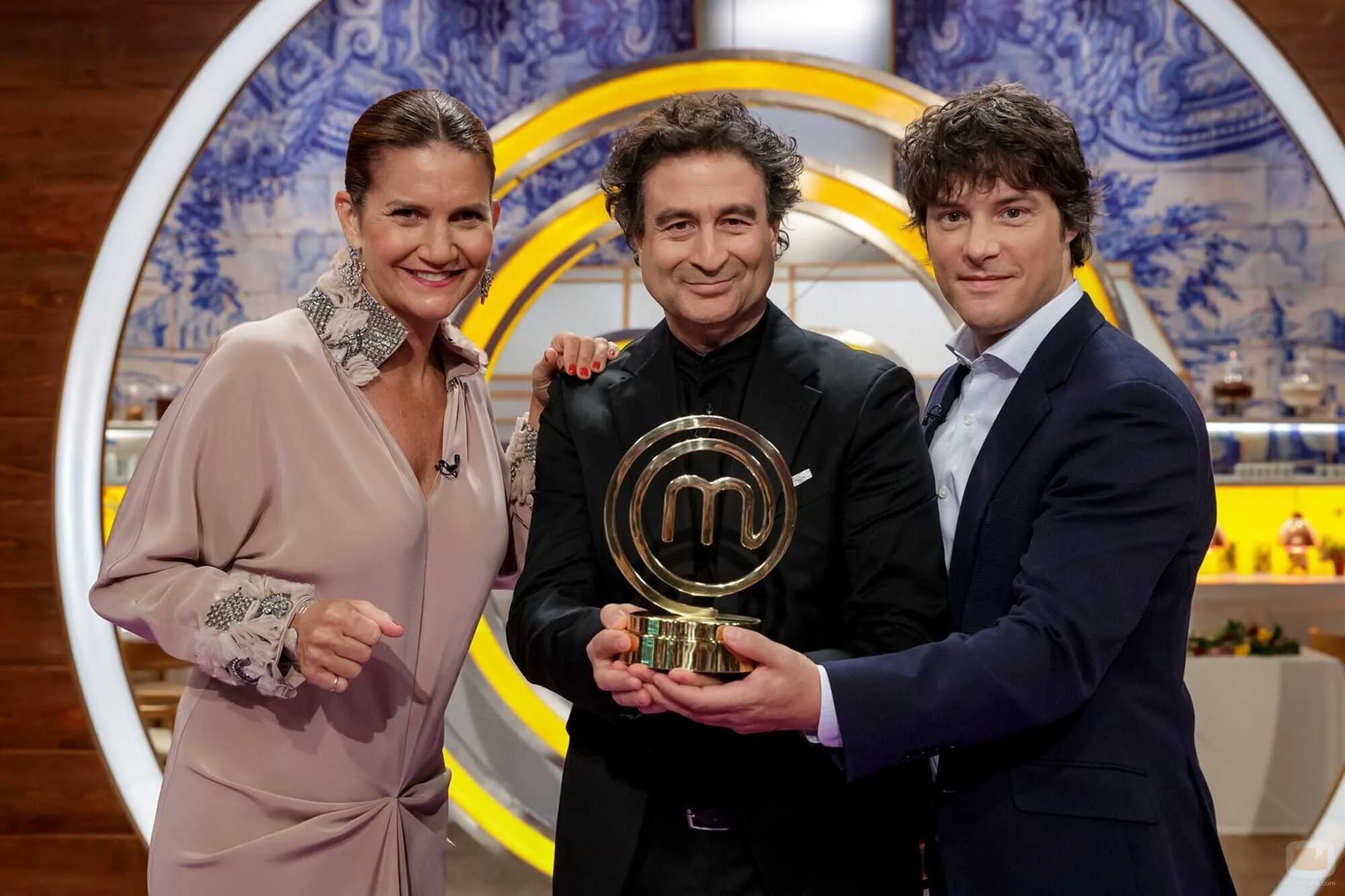 Samantha Vallejo-Nágera, Pepe Rodríguez y Jordi Cruz posan con el trofeo antes de entregárselo al finalista ganador del duelo.
