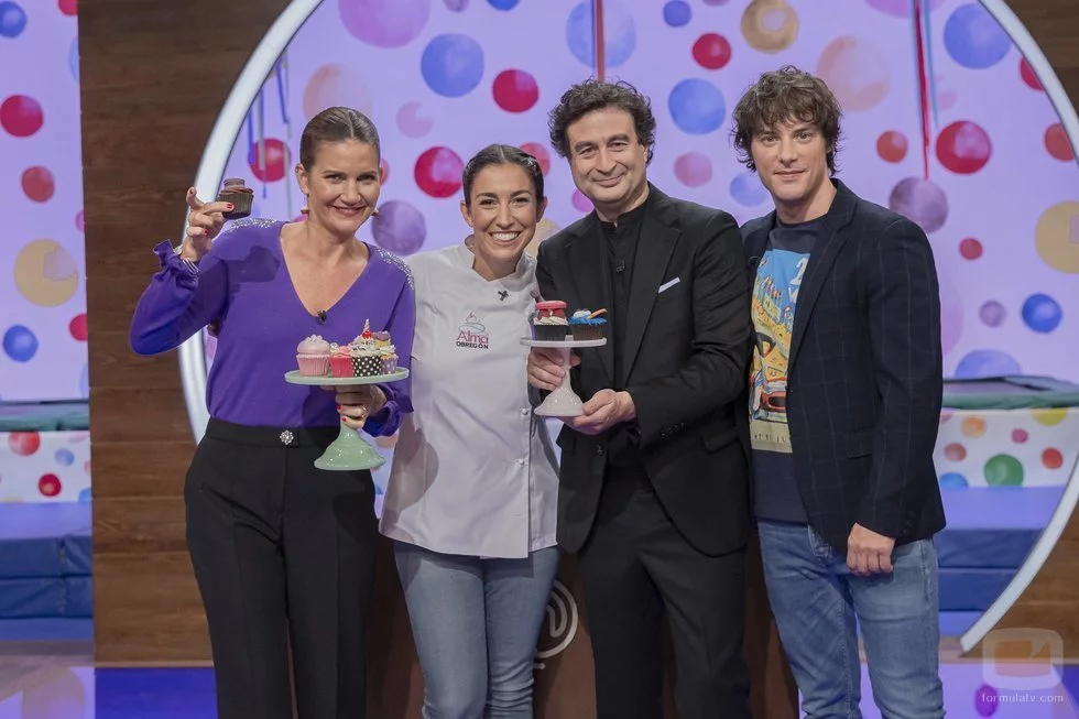 Pepe Rodríguez, Jordi Cruz y Samantha Vallejo-Nágera posan en la semifinal junto a Alma Obregón, experta en cupcakes.
