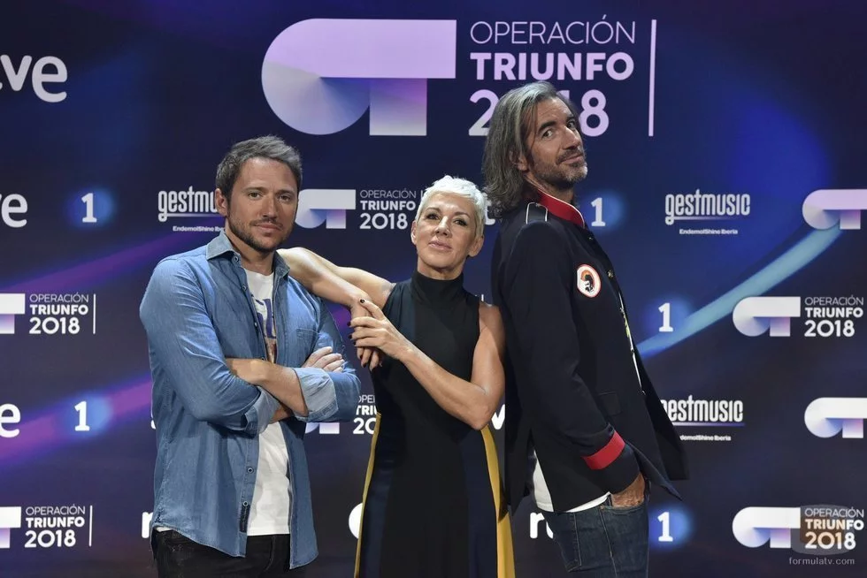 El jurado de 'Operación Triunfo 2018', compuesto por Manuel Martos, Ana Torroja y Joe Pérez posa sonriente en la rueda de prensa.