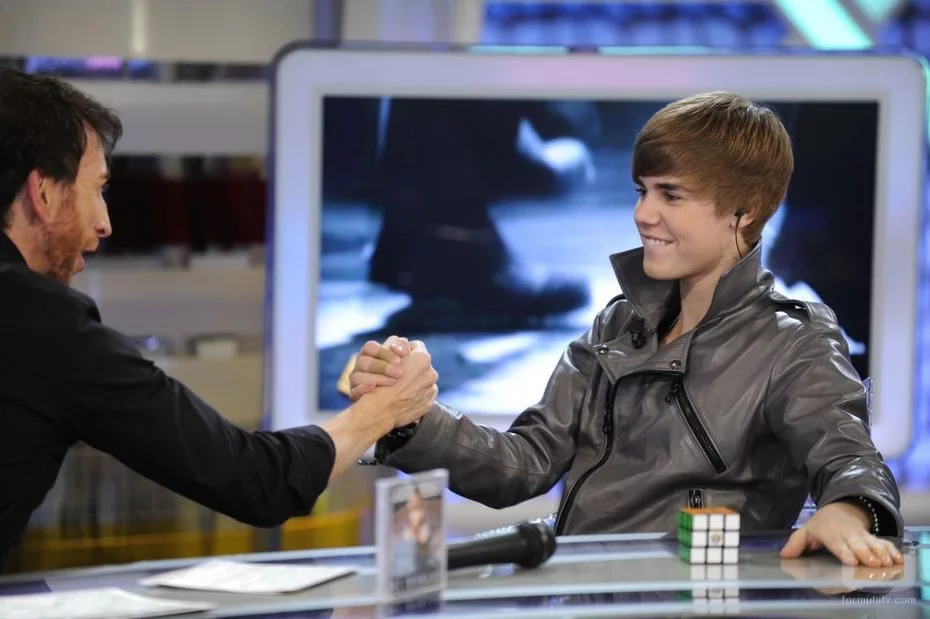 Justin Bieber y Pablo Motos echan un pulso durante su visita a 'El Hormiguero'.
