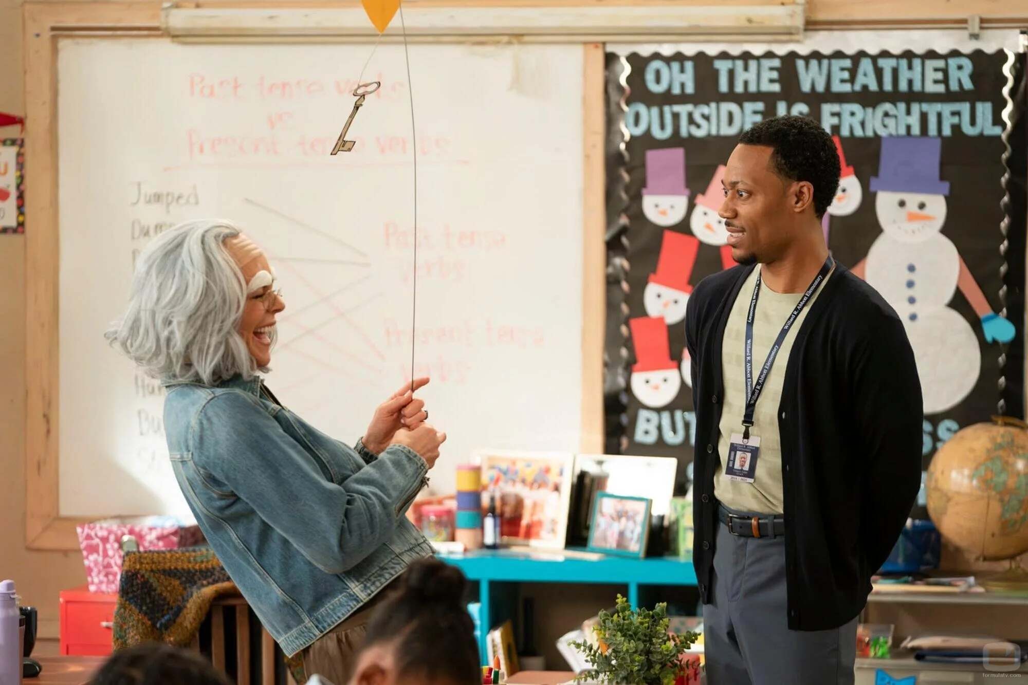 Tyler James Williams y Kaitlin Olson aparecen en una imagen del capítulo 4x09 de 'Colegio Abbott' con fecha de estreno el Miércoles, 08 de Enero de 2025.