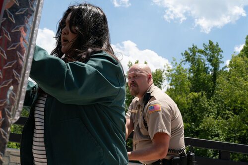 Hunter Emery y Karen Rodriguez aparecen en una escena promocional del episodio 1x07 de 'Las esposas cazadoras'.