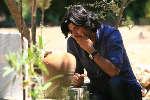 Kerim se encuentra arrodillado delante de una tumba. Está con la mano en la cara a punto de ponerse a llorar.