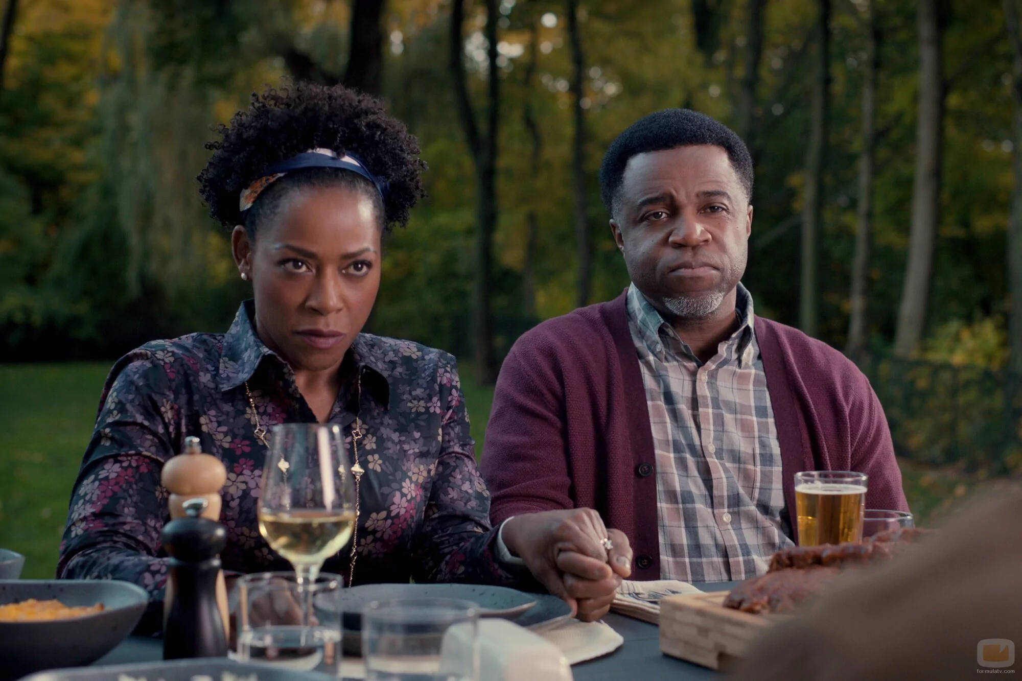 Kevin Hanchard y Karen LeBlanc aparecen en una imagen promocional del episodio 'Bu, puta' de 'Ginny & Georgia'.